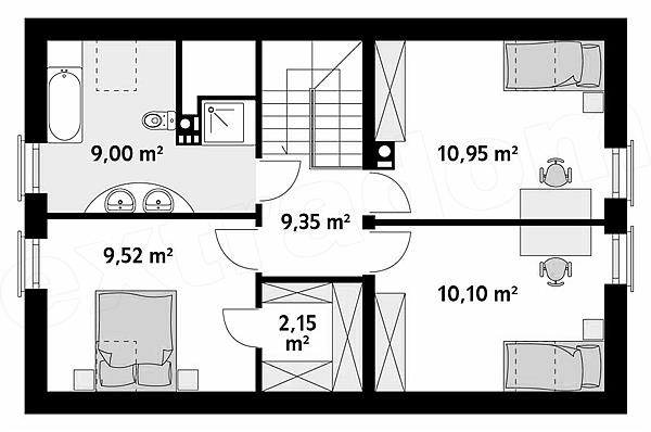 Zwarty energooszczędny dom o prostej bryle. Na poddaszu zaprojektowano przestronne trzy sypialnie z dużą łazienką i pomieszczeniem gospodarczym. Na parterze funkcjonalnie rozplanowano pomieszczenia dzienne i pomieszczenia pomocnicze. Dobrym rozwiązaniem jest połączenie domu z garażem poprzez śluzę, jaką jest wiatrołap. W kuchni znajduje się spiżarnia.