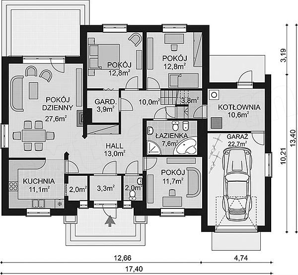 Elegancki dom o zgrabnej sylwetce i układzie pomieszczeń zapewniającym mieszkańcom duży komfort. Obszerny dom dla 4-osobowej rodziny, z garażem wkomponowanym w bryłę budynku. Wejście do domu, osłonięte łukowym podcieniem, prowadzi do przedsionka i dalej do centralnie usytuowanego hallu z miejscem na dużą szafę wnękową. Usytuowana od frontu kuchnia posiada wydzieloną spiżarnię oraz połączenie ze znajdującym się w głębi domu obszernym pokojem dziennym, którego część jadalna sąsiaduje bezpośrednio z kuchnią. Na szerszych działkach możliwe jest powiększenie jadalni o wykusz, co wzbogaci również bryłę domu. Część wypoczynkowa pokoju dziennego zawiera kominek i wyjście na obszerny taras. Część sypialna zawiera trzy wygodne sypialnie, garderobę i komfortowo wyposażoną łazienkę. Pokój przy wejściu do domu może pełnić także funkcję gabinetu. Pod schodami na poddasze znajduje się przejście do części gospodarczej i garażu.