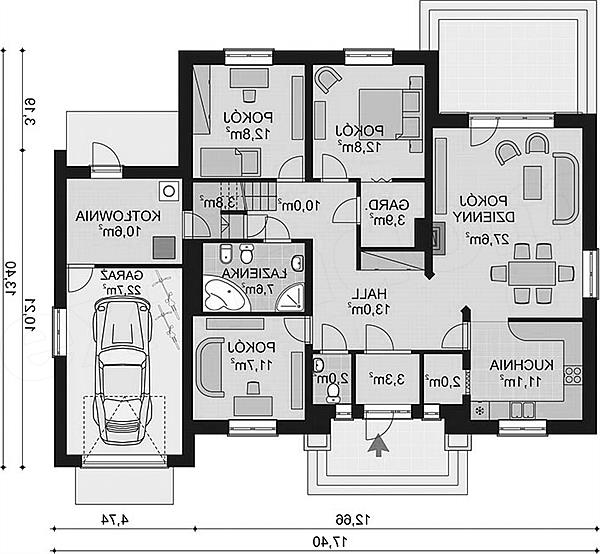 Elegancki dom o zgrabnej sylwetce i układzie pomieszczeń zapewniającym mieszkańcom duży komfort. Obszerny dom dla 4-osobowej rodziny, z garażem wkomponowanym w bryłę budynku. Wejście do domu, osłonięte łukowym podcieniem, prowadzi do przedsionka i dalej do centralnie usytuowanego hallu z miejscem na dużą szafę wnękową. Usytuowana od frontu kuchnia posiada wydzieloną spiżarnię oraz połączenie ze znajdującym się w głębi domu obszernym pokojem dziennym, którego część jadalna sąsiaduje bezpośrednio z kuchnią. Na szerszych działkach możliwe jest powiększenie jadalni o wykusz, co wzbogaci również bryłę domu. Część wypoczynkowa pokoju dziennego zawiera kominek i wyjście na obszerny taras. Część sypialna zawiera trzy wygodne sypialnie, garderobę i komfortowo wyposażoną łazienkę. Pokój przy wejściu do domu może pełnić także funkcję gabinetu. Pod schodami na poddasze znajduje się przejście do części gospodarczej i garażu.