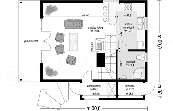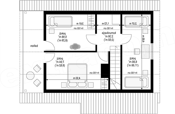 Projekt domu Chatka Drewniana to wymarzony dom na działkę rekreacyjną lub do całorocznego zamieszkiwania. Mimo niewielkiej powierzchni cechuje się funkcjonalnym wnętrzem i mieści w sobie wszystkie potrzebne pomieszczenia: na dole wygodny salon z kominkiem, kuchnią i łazienką, na poddaszu 2 lub 3 sypialnie.