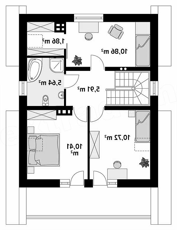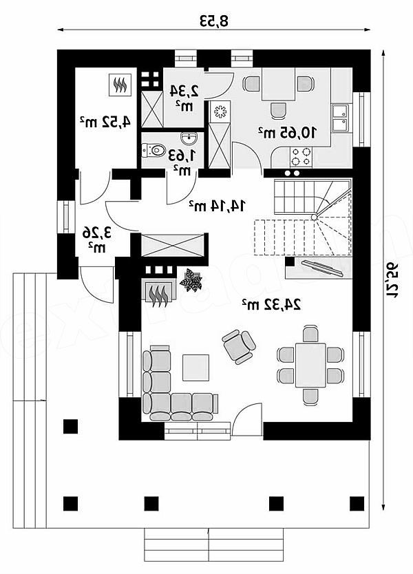 Nieduży dom jednorodzinny, przeznaczony dla 4-osobowej rodziny. Na parterze zaprojektowano pomieszczenia strefy dziennej oraz pomieszczenie gospodarcze. Na poddaszu zlokalizowano pomieszczenia strefy nocnej.