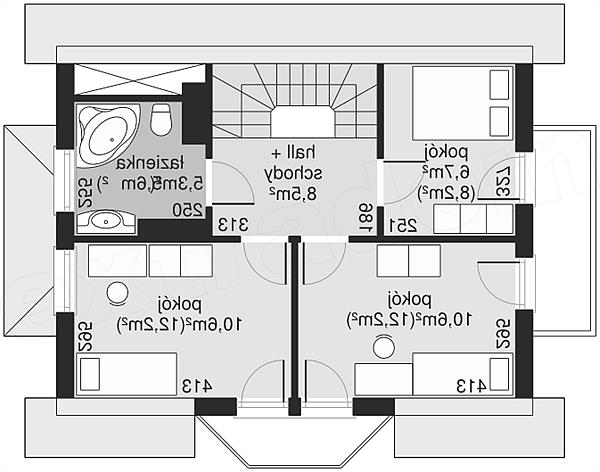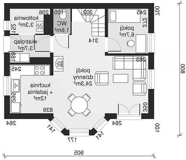 Na powierzchni 70,65 m2 znajdują się: pokój z kominkiem, połączona z pokojem dziennym kuchnia, sypialnia 10m2 i łazienka. Po drewnianych schodkach wchodzi się na poddasze, gdzie znajduje się wielka sypialnia z wyjściem na balkon zadaszony. Ogrzewanie elektryczne i centralnie ustawiony kominek ogrzeje doskonale całość. Dom do 70 m.
