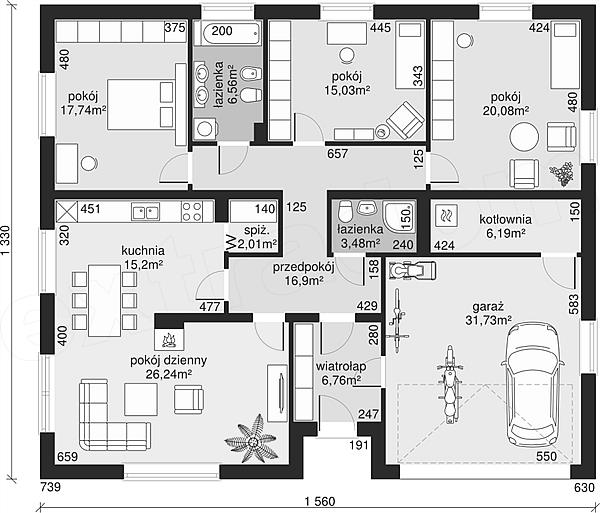Parterowy, nowoczesny dom, w którym liczy się przestrzeń. Biel ścian dobrze komponuje się z ciemną stolarką okienną i grafitowym, eleganckim dachem kopertowym. W środku optymalny dla wymagających mieszkańców układ pomieszczeń: duża, otwarta część dzienna oddzielona od sypialni. Ponieważ to nie jest dom dla jednej lub dwóch osób, posiada garaż na dwa samochody. Projekt nadaje się do adaptacji na działkach z wjazdem od strony południowej (także od południowo-wschodniej i w odbiciu lustrzanym od południowo-zachodniej).