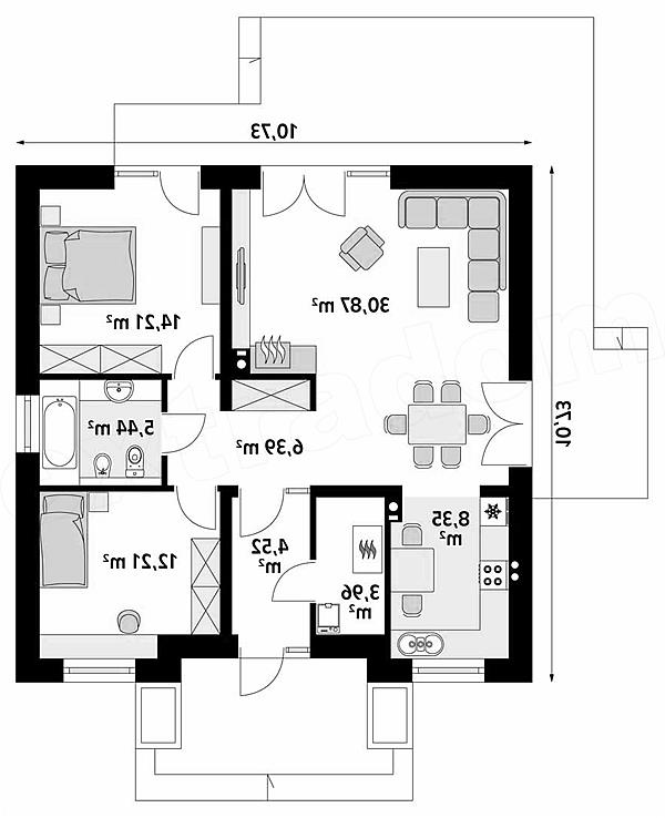 Niewielki, jednorodzinny dom parterowy, odpowiadający potrzebom 3 - 4-osobowej rodziny. Optymalny układ pomieszczeń został podzielony na dwie strefy: dzienną - kuchnia i salon z jadalnią oraz nocną: dwie sypialnie i łazienka.