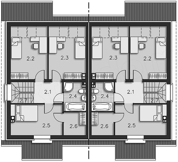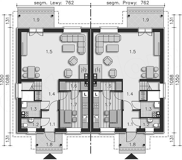 Typowy dom bliźniaczy funkcjonalnie zaplanowany dla 4-osobowej rodziny. Dom ten charakteryzuje się prostą architekturą i nieskomplikowanymi rozwiązaniami konstrukcyjnymi, co znacznie obniża koszty realizacji. Na parterze znajduje się duży salon, kuchnia z kątem do jedzenia i praktyczną spiżarką, pom. gospodarcze, w którym został umieszczony dwufunkcyjny kocioł gazowy oraz toaleta dostępna z wiatrołapu. Na poddaszu są trzy pokoje, w tym jeden z garderobą, oraz łazienka doświetlona światłem naturalnym poprzez świetlik rurowy. Dom można również zestawiać w zabudowę szeregową Orlando (LMS01). Dostępna jest wersja projektu z garażem.Projekt domu dostępny w zabudowie bliźniaczej lub jako jednorodzinny dwulokalowy.