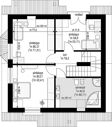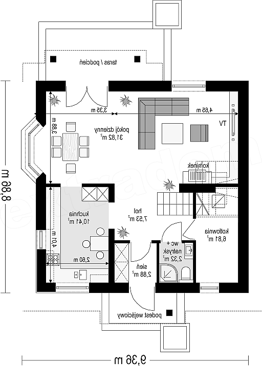 Projekt domu Michałek to śliczny domek jednorodzinny – zrealizowany jako „braciszek” projektu „ Michalina ” - oba domy mają podobną wielkość i rozplanowanie wnętrza , różną się kształtem dachu). Michałek został zaprojektowany jako wygodny dom dla czteroosobowej rodziny - jest parterowy z poddaszem użytkowym. Na parterze przewidziano obszerną część dzienną, z salonem, aneksem jadalnym, ładną – częściowo otwartą kuchnią, holem i dużą kotłownią. Na poddaszu mieszczą się trzy sypialnie i wygodna łazienka. Tradycyjna bryła budynku, zbudowana na planie kwadratu, została przekryta dwuspadowym dachem, z lukarnami. Elewację frontową urozmaica zadaszenie nad wejściem, wsparte na kolumnie i zastrzale. Elewację ogrodową ozdabiają: lukarna z balkonikiem i zadaszenie tarasu podparte kolumnami. Architektura domu jest spokojna i skromna, jednocześnie zachowane zostały właściwe proporcje bryły. Projekt domu Michałek to doskonała propozycja dla Inwestorów szukających niedużego, wygodnego domu dla swojej rodziny, biorących pod uwagę oszczędność kosztów, prostotę budowy i niewielki koszt utrzymania domu. Pracownia posiada wersję odbicia lustrzanego projektu.