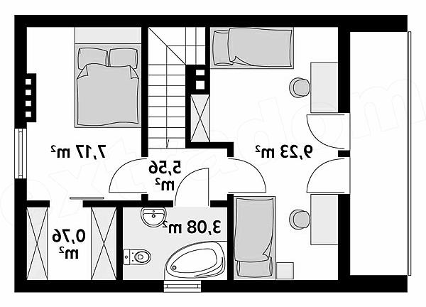 Mały, funkcjonalny dom jednorodzinny z użytkowym poddaszem o prostej, tradycyjnej bryle. Wyraźny podział funkcjonalny na część dzienną (parter) i nocną (poddasze). Na parterze zlokalizowano pokój dzienny z kominkiem i przyległym zadaszonym tarasem, kuchnię z jadalnią i łazienkę. Na poddaszu znajdują się dwie sypialnie, łazienka i garderoba.