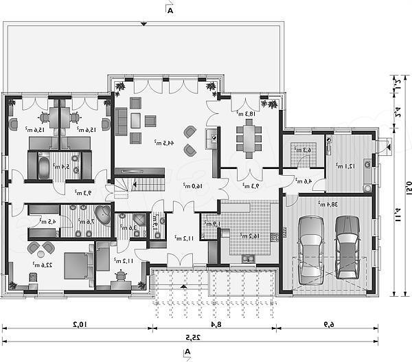 Parterowa rezydencja o powierzchni powyżej 200m2 z podwójnym garażem to wyjątkowe rozwiązanie. Projekt domu Willa Marynin proponuje niski, rozległy budynek przekryty nieregularnym układem przenikających się czterospadowych dachów o średnim nachyleniu. Ze swobodnie zarysowanego rzutu wyrastają trzy części willi przesunięte względem siebie przy środkowej, wejściowej wnęce z tarasem przed główną z nich mieszczącą strefę dzienną. Poza sienią z dodatkowym pokojem i łazienką znajduje się tu niezwykle obszerny, otwarty na hol pokój dzienny wysoki po sam dach. Jadalnia sąsiaduje z salonem i dużą kuchnią stanowiącą jednocześnie przechodni łącznik z częścią gospodarczą. Przedsionek prowadzi tu do spiżarni, kotłowni z pralnią i garażu. Po przeciwnej stronie holu znalazła się zamykana strefa nocna z izolującymi od komunikacji (przedsionki z szafami) trzema sypialniami dla czterech osób. W projekcie domu Willa Marynin część nieużytkowego poddasza dostępna jest schodami z holu i możliwa do zagospodarowania. Mało rygorystyczny kształt bryły podkreśla swobodny rysunek elewacji z narożnym oknami, niesymetryczne akcentowanie frontu z rabatą i pergolą.