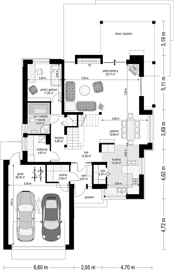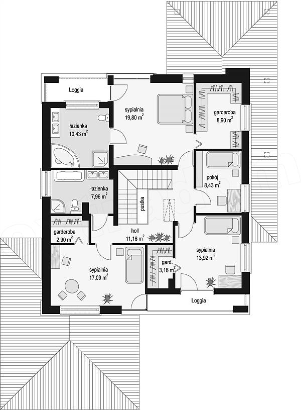 Projekt domu Willa na Borowej to piętrowy dom jednorodzinny dla rodziny cztero-sześcioosobowej, przykryty czterospadowym dachem. Dom jest podmiejską willą o nowoczesnej ale spokojnej architekturze. Zwarta bryła budynku z dobudowanym garażem i dużym zadaszonym podcieniem z tyłu domu, została ciekawie ozdobiona klinkierowymi i drewnianymi okładzinami elewacji, oraz loggiami i podcieniem wejściowym. Masywny ozdobny komin kominka wewnętrznego i zewnętrznego, czy narożne okna - to dodatkowe ozdoby bryły. Wszystkie elementy tworzą spójną, spokojną kompozycyjnie całość. W projekcie Willa na Borowej, na parterze zaprojektowano duży salon z jadalnią i holem, z częściowo otwartą kuchnią, oraz dodatkowy pokój - gabinet lub sypialnię gościnną. Na piętrze umieszczono sypialnie, z odrębnym apartamentem rodziców, z własną łazienką, garderobą i balkonem z widokiem na ogród. Na parterze przez szerokie przeszklenia z salonu zaplanowano wyjście do dużego podcienia i na taras ogrodowy.