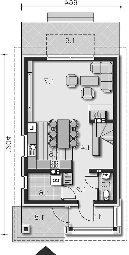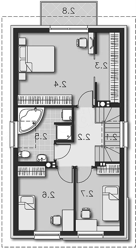 Ciekawy dom z użytkowym poddaszem, doskonały na wąską działkę. Na parterze, w części wspólnej, dziennej, przewidziano salon z kominkiem i pięknym dużym oknem, będącym jednocześnie wyjściem na taras, otwartą na salon kuchnię z miejscem na rodzinny stół, wc, pomieszczenie gospodarcze i kotłownię. Poddasze to część wyraźnie nocna, gdzie zaprojektowano trzy sypialnie, w tym jedną z własną garderobą i wyjściem na balkon oraz wygodną, dużą łazienkę.